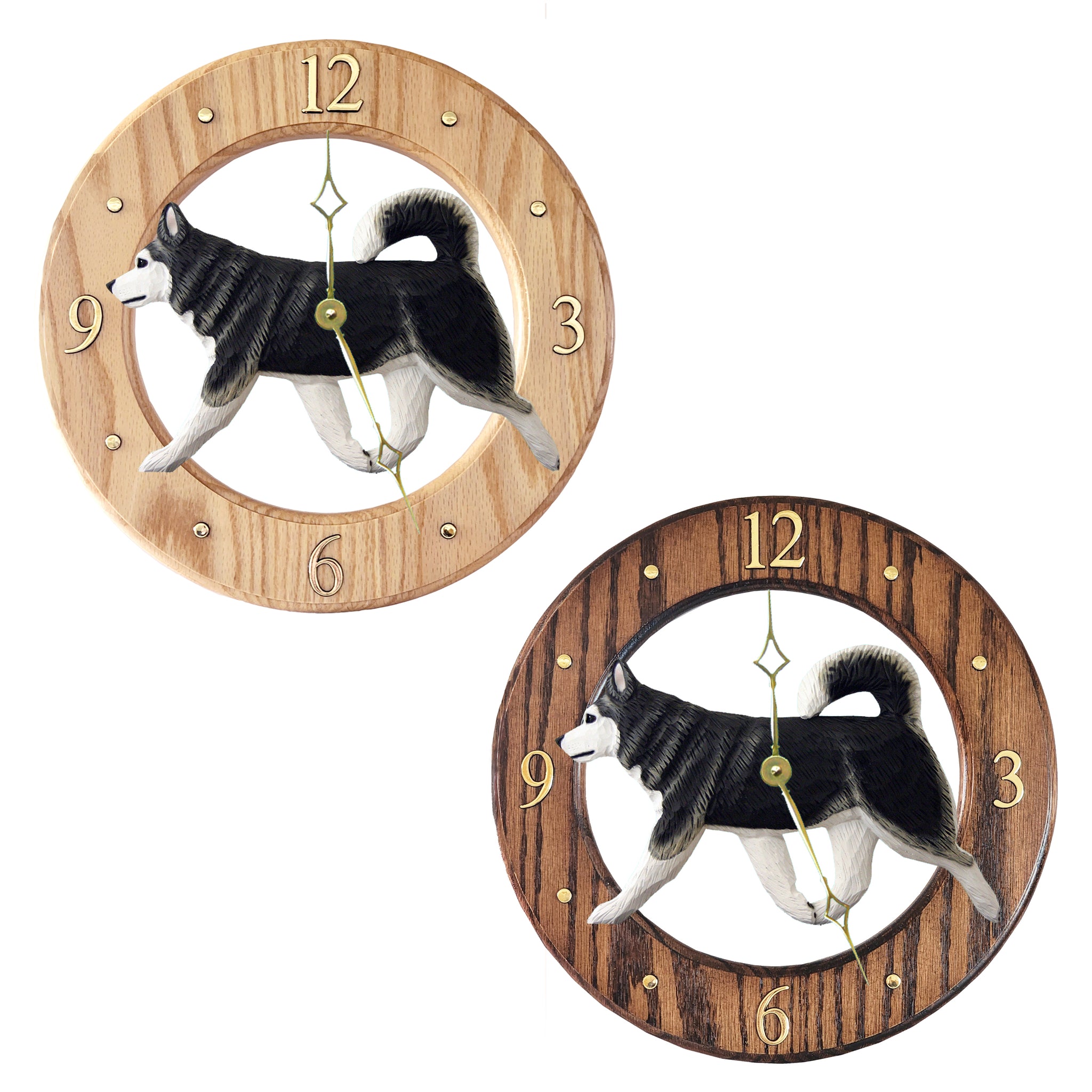 Beautifully hand-crafted solid oak dog breed wall clock featuring a 2-dimensional resin dog breed reproduction of an original wood carving. Accented with gold-plated numerals and hands. The reliable quartz movement requires a single AA battery (not included). Great for displaying in the kitchen, living room or den. Available in light or dark oak. Clock measures 12 3/4" in diameter X 3/4" deep.